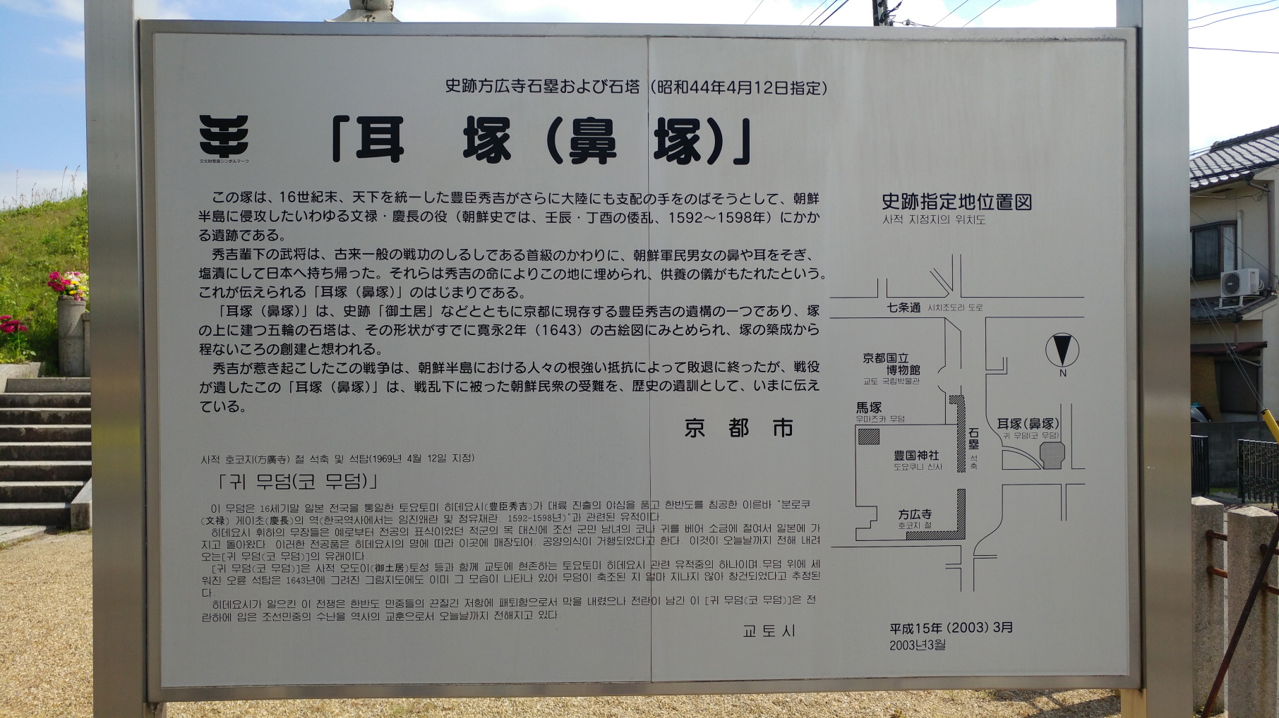 임진왜란 당시 일본의 무사들이 자신의 전공을 증명하기 위해 조선인의 귀나 코를 베어 소금에 절여 가져왔다고 하는데, 이후 이 '전공품'들은 히데요시의 명에 따라 이곳에 매장되었다고 한다. 그리고, 이곳은 귀무덤(코무덤) 미미즈카로 불리게 되었다고.