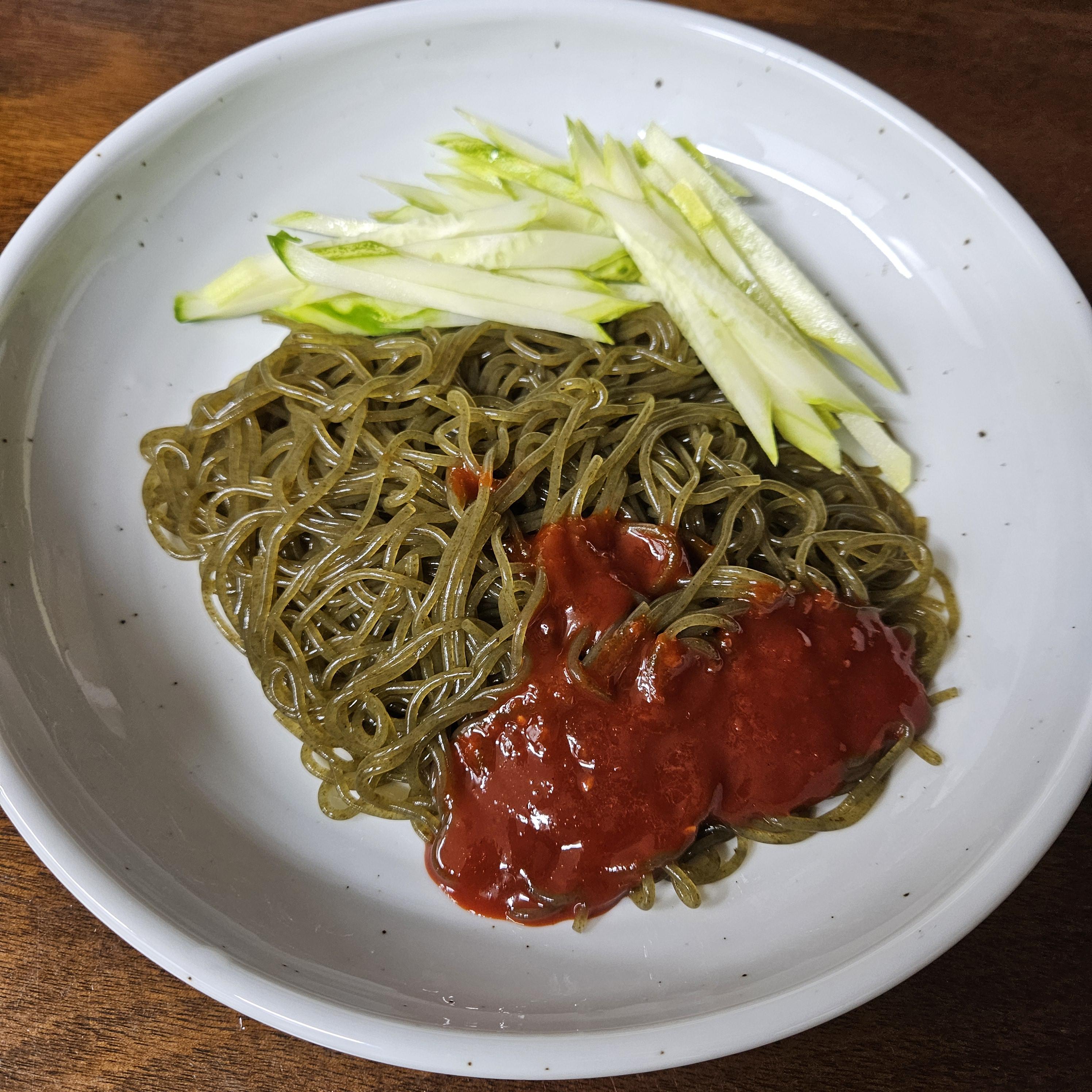 씹는 맛을 위해 오이를 채썰어 올려 후루룩.