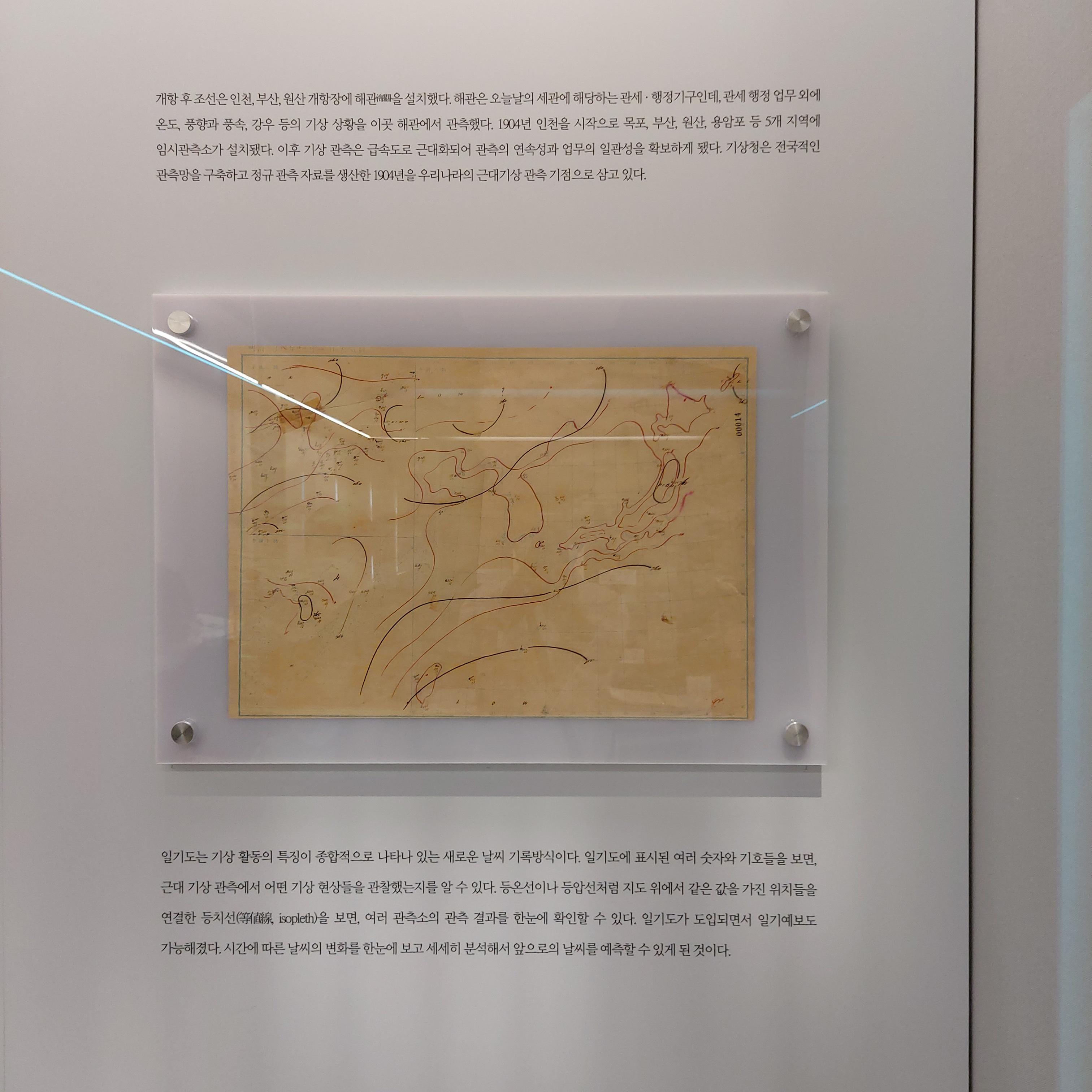 1905년 당시 사용했던 일기도가 전시되어 있는데, 일기도에는 등온선, 등압선 등이 표시되어 있다. 일기도는 기상 활동의 특징이 종합적으로 표시된 날씨 기록방식이라고 한다.