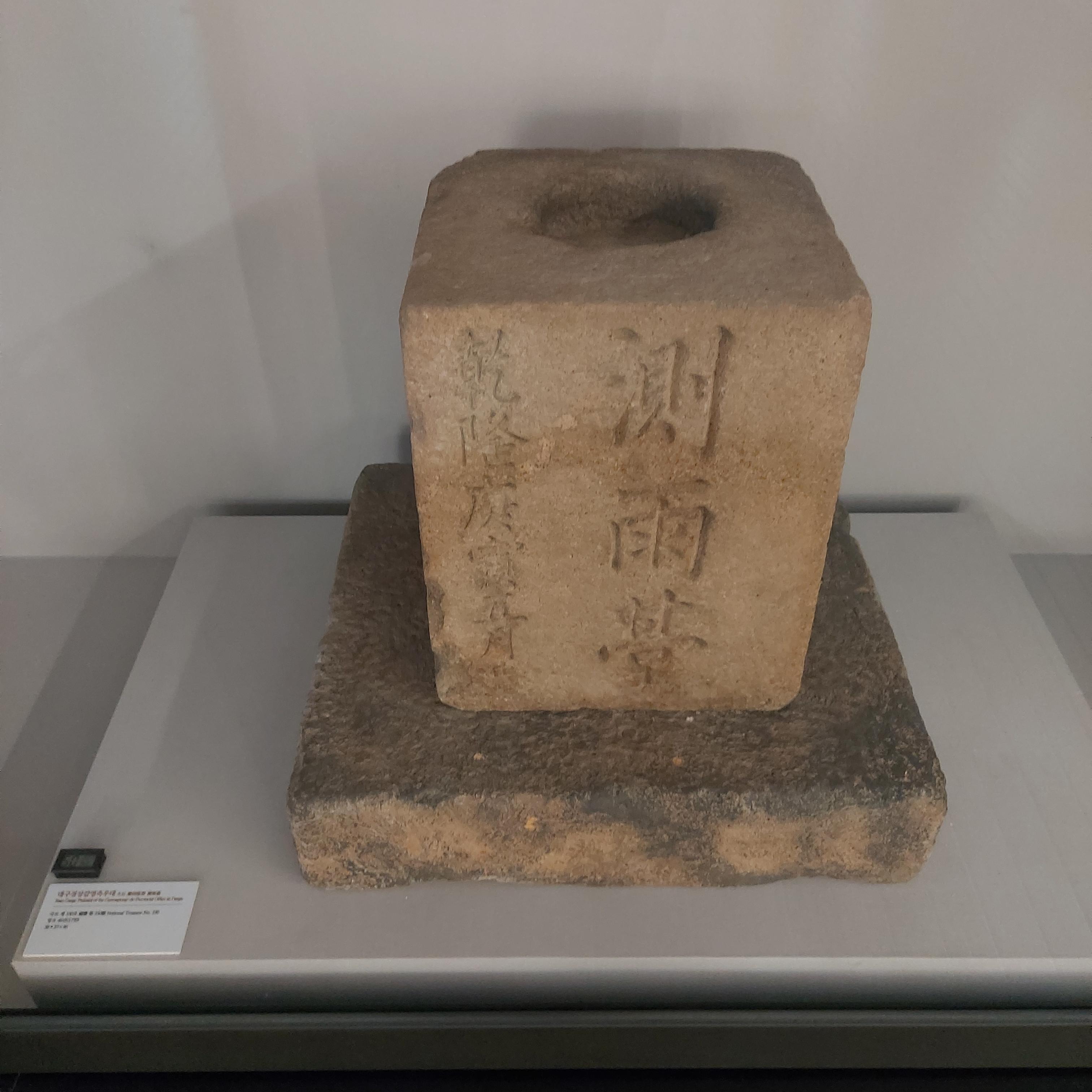 국보 제330호인 측우대이다. 측우기를 받치는 역할을 하는 것으로, 조선시대(1770년) 대구경상감영측우대이다.