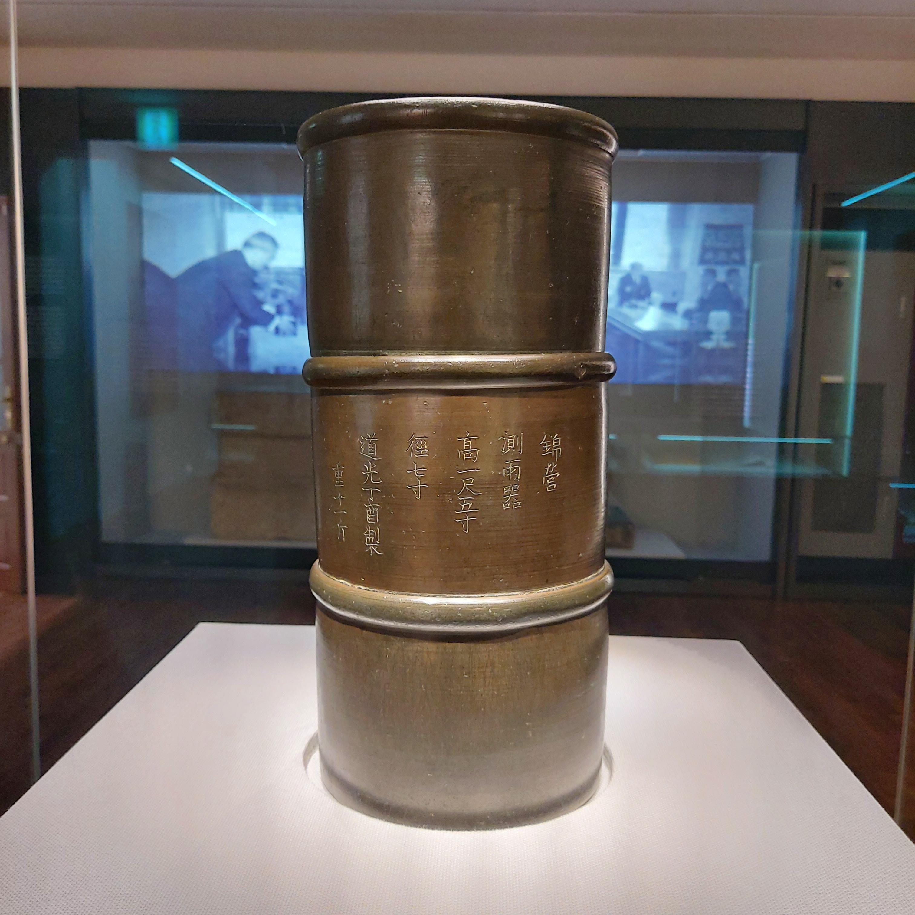 둥근 원통 모양은 측우기이다. 공주충청감영에서 사용하던 측우기로 이 측우기도 국보이다.(국보 제329호)