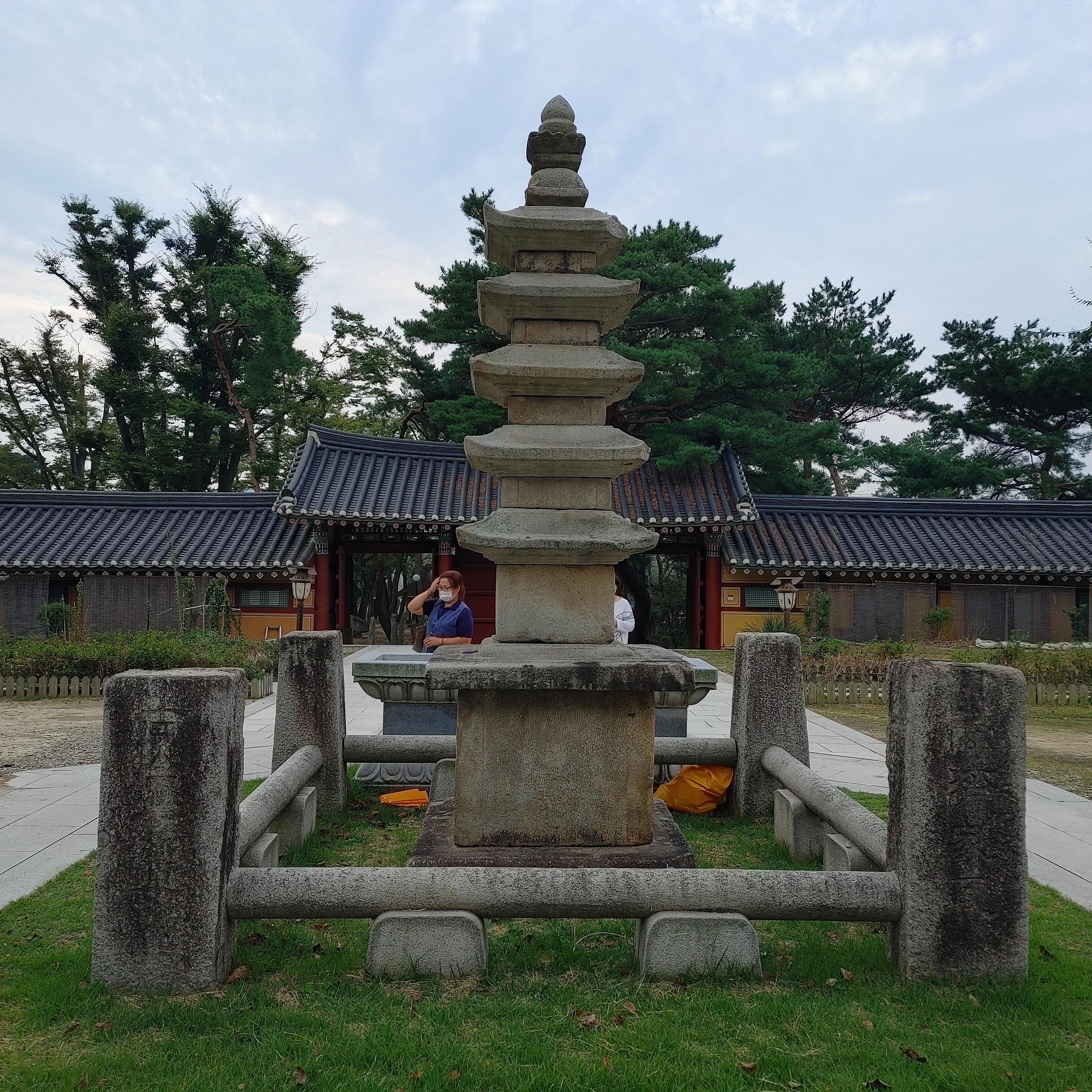절 문에 들어서면 단아한 모습의 탑이 나타난다. 보통 탑은 대웅전 앞 마당에 있는 편인데, 여기는 멀리, 두 단이나 낮은 곳에 있어 특이하다. 하지만, 대웅전 부처님이 앉은 곳에서 일직선 상에 있어, 부처님의 시야가 닿는다.