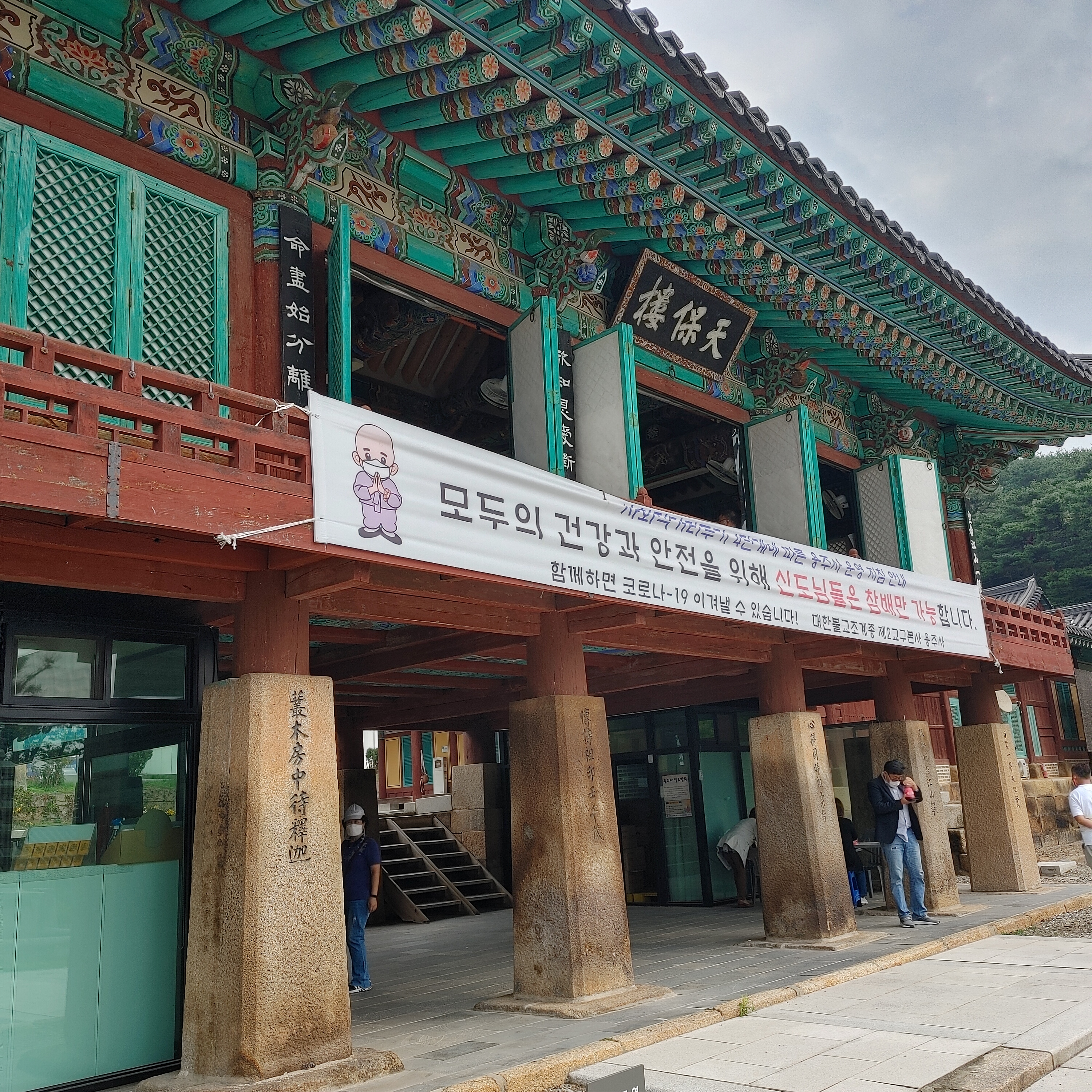 이 누각의 특이한 점 하나더. 밖에서 보는 누각의 이름은 천보루인데, 안쪽 대웅보전 쪽에서 보면 누각 이름이 홍제루라고 적혀 있다. '밖으로는 하늘이 보호하는 곳이고, 안으로는 널리 백성을 구제하여 백성들이 불성을 깨닫게 하는 곳'이라는 의미를 담고 있다고 한다.