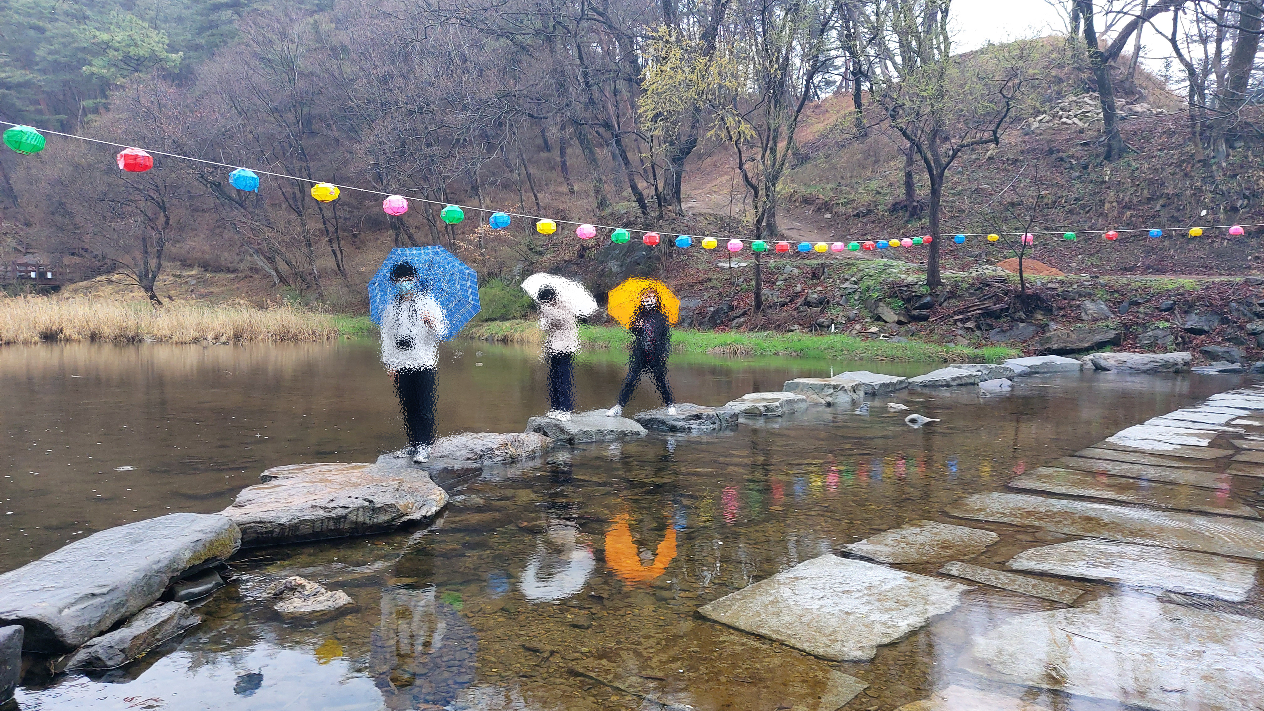 대웅보전을 둘러보고 영산전으로 향하는 길. 경내에 큰 시내가 있어 건너가야 한다. 큰 다리를 건너 갈 수도 있고, 징검 다리를 건너갈 수도 있다. 마곡사는 절 안의 건물 배치, 가람이 다른 절과는 다른 독특함이 있다. 자연 지형들을 그대로 살린 듯하다. 우리는 징검다리를 건너 영산전으로 향했다. 마침 영산전 주변에 계시던 보살님이 영산전에 대해 설명을 해주셨다.