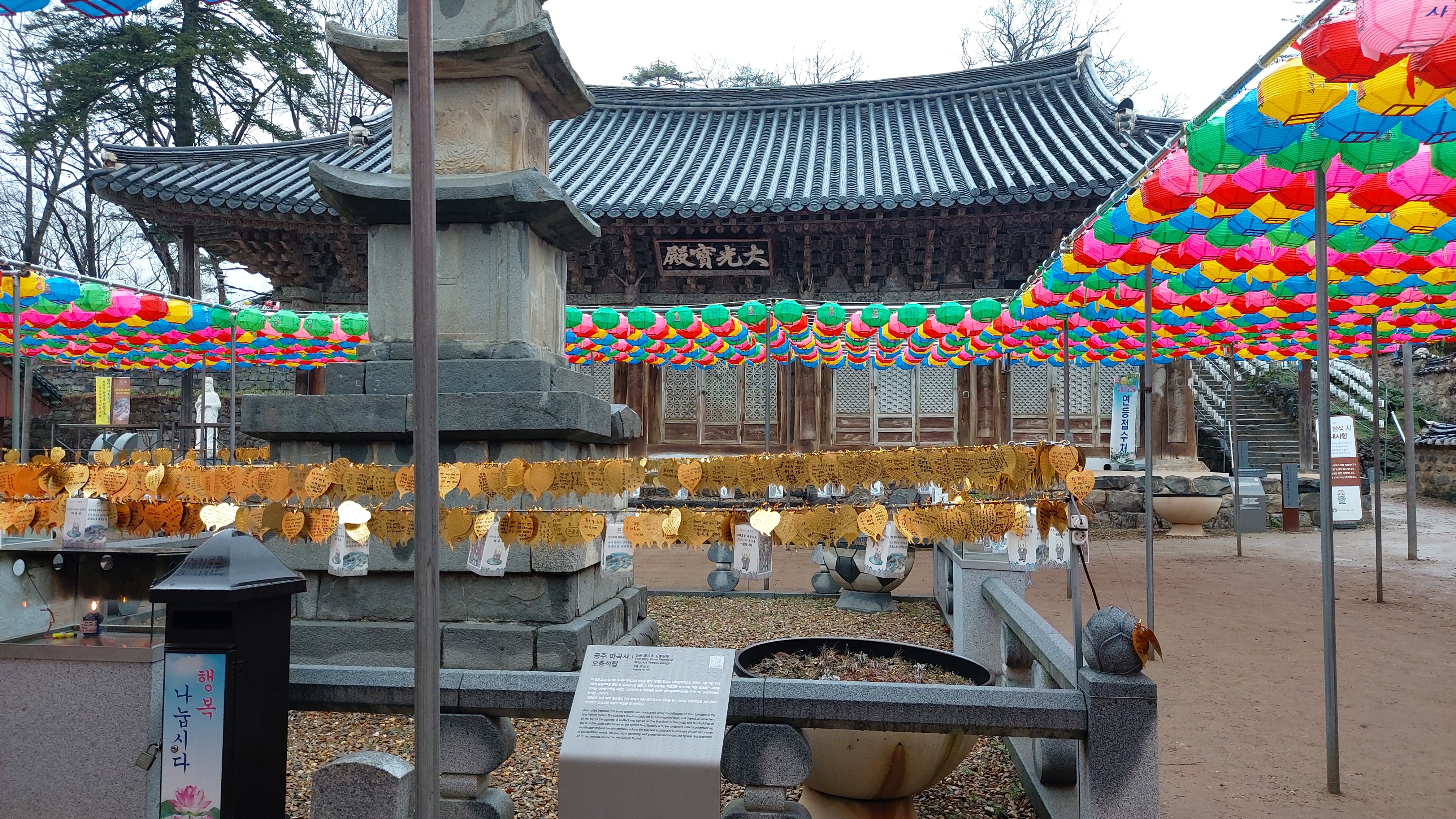 오층 석탑 주변에는 고운 금색 나뭇잎이 주렁주렁 걸려있다. 가까이 다가가 보니 금지 한 장 한 장에 작은 글씨로 소원들이 적혀 있다. 각자의 바람을 적어 절 마당에 걸어둔 것인데, 탑과 잘 어울린다. 소원 적는 종이는 탑 옆쪽 안내소에서 따로 구매한다.