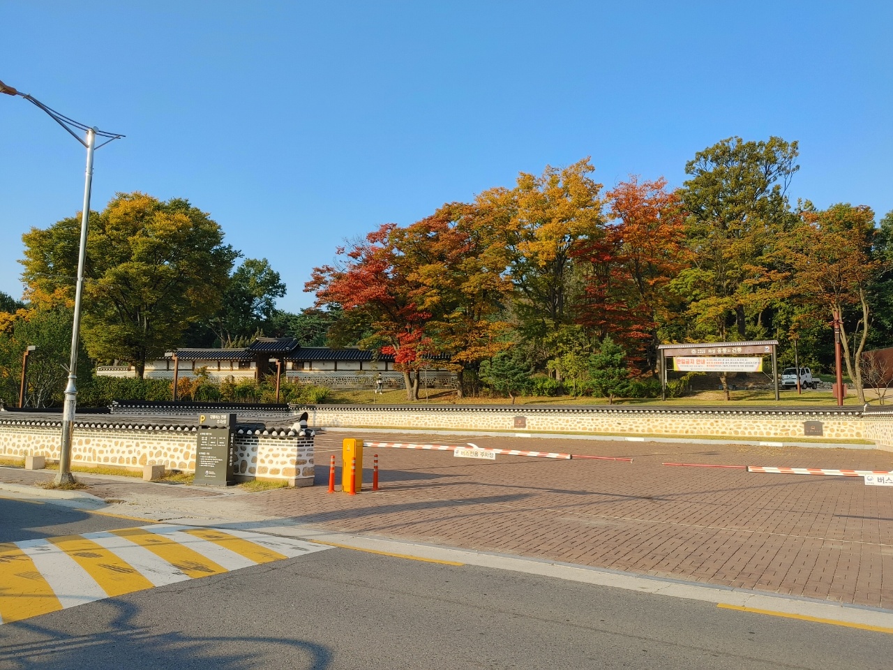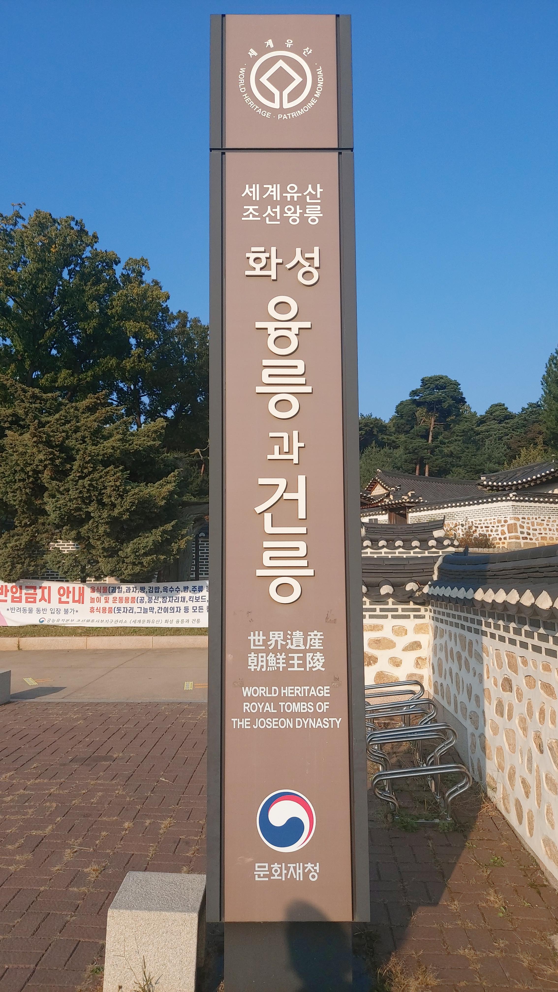 주차장에서 매표소 걸어가는 길. 담장 너머로 기와집과 단풍 든 나무들이 보인다. 능은 안쪽 깊숙이 걸어 들어가야 만날 수 있다. 매표소 옆에 세계유산 조선왕릉 화성 융릉과 건릉 안내 기둥이 있다.