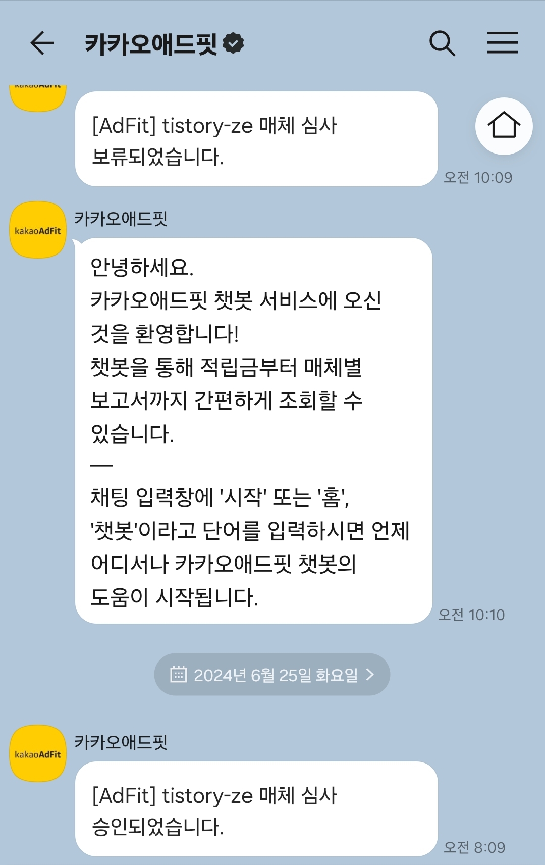 다음날 아침 바로 메시지가 왔다. 카카오 애드핏 '매체심사 승인되었습니다.'